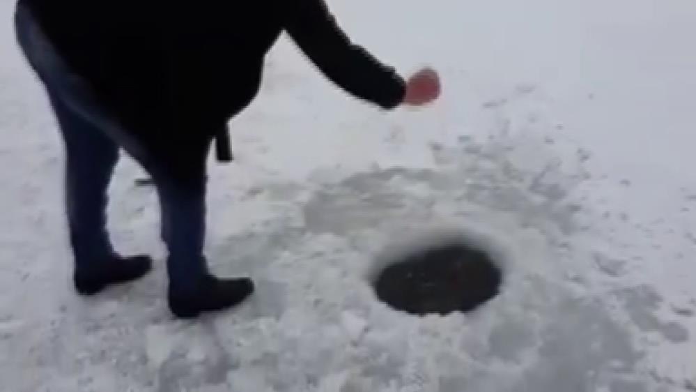 Erzurum‘un Aşkale ilçesinde soğuk havanın hüküm sürdüğü bugünler de gençler buzu kırıp balık tutuyor.